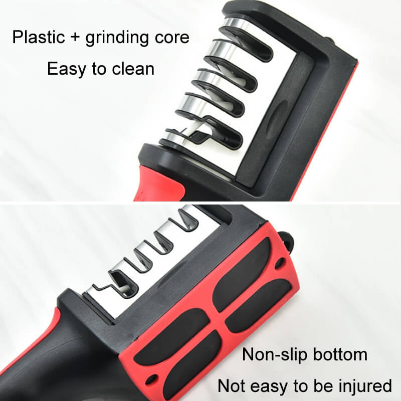 Every kitchen needs a Multi-Functional Kitchen Hanging Four-Stage Handheld Knife Sharpener. Its flexible form lets you easily sharpen several kinds of knives and scissors. Convenient storage is offered by the hook design; cleaning is simple using the plastic and grinding core materials. The detachable design makes cleaning and sharpening replacement simple; the anti-slip base guarantees safety throughout use. Perfect for daily use, this small and light sharpener is sharp.